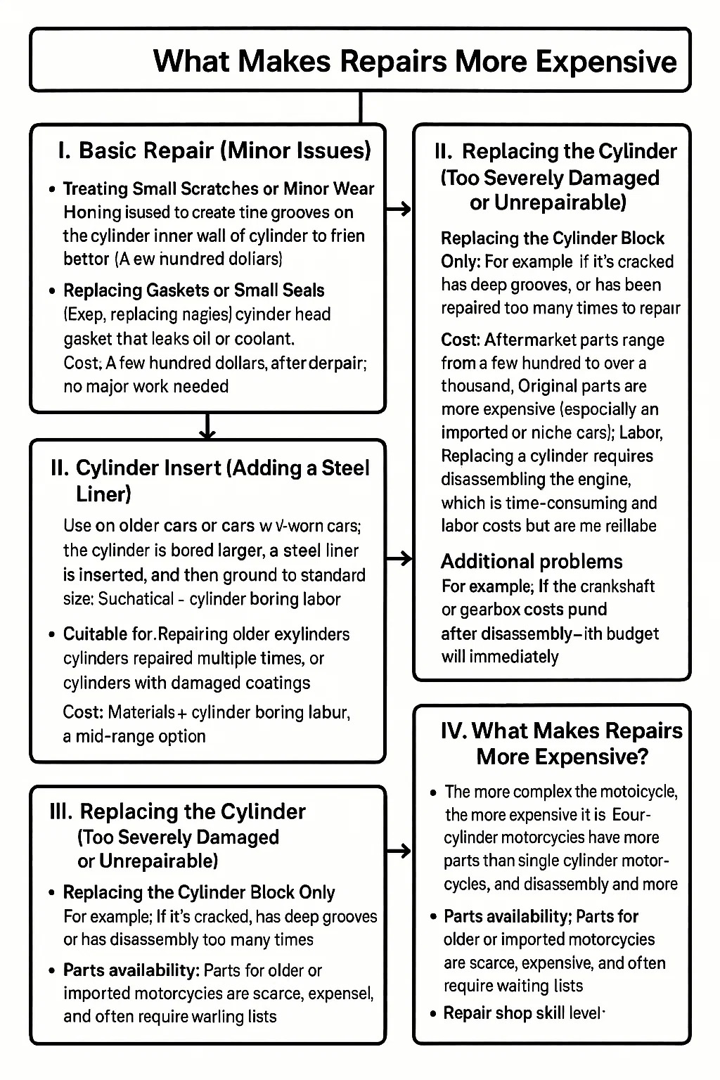O custo de consertar um cilindro de motocicleta depende principalmente da gravidade do problema, do tipo de reparo necessário e da estrutura da motocicleta. Abaixo estão explicações para situações comuns: