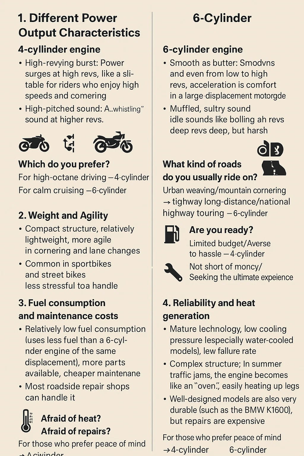 A escolha entre um motor de 4 e 6 cilindros para sua motocicleta depende do uso e estilo de sua preferência. Aqui está uma comparação: