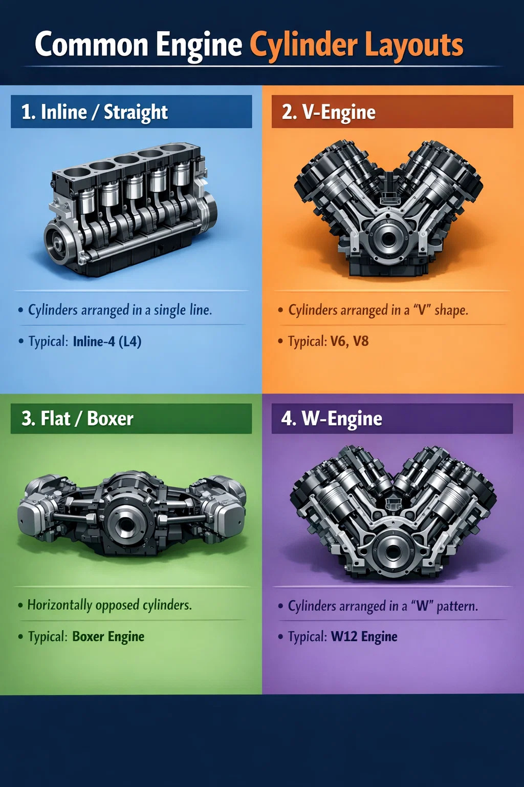 Aplicações: Comumente encontrado em sedãs de médio a grande porte ou carros esportivos de alto desempenho (como V6, V8). No campo das motocicletas, o V-twin é um clássico, conhecido pelo seu ritmo único e forte torque em baixas rotações.