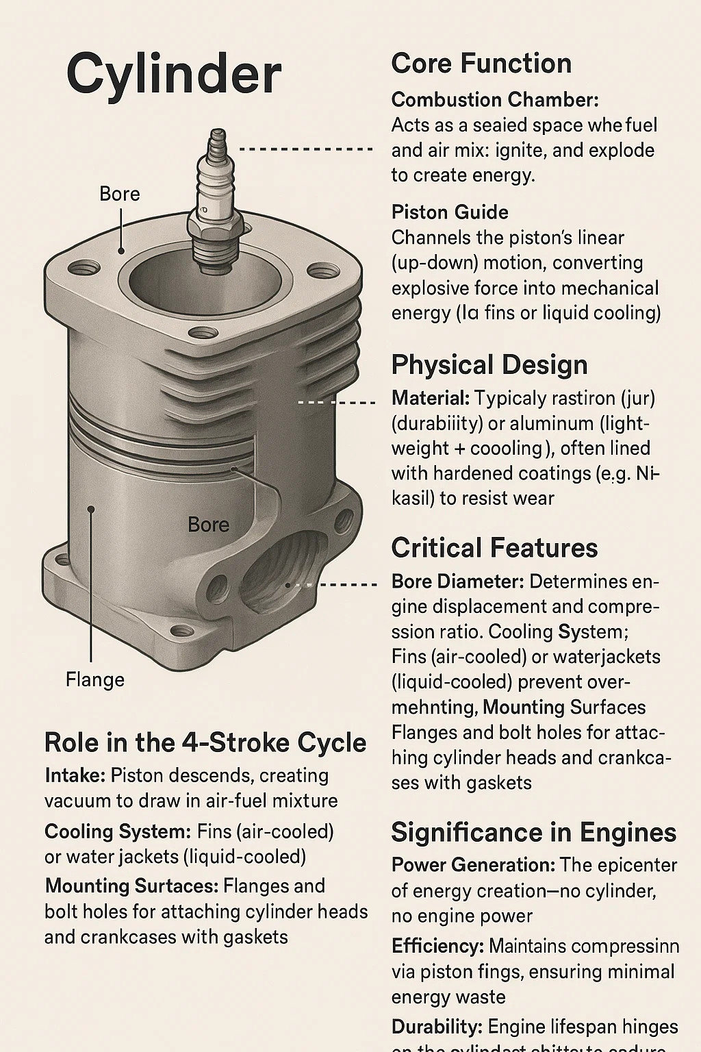 Material: Normalmente ferro fundido (durabilidade) ou alumínio (resfriamento leve), geralmente revestido com revestimentos endurecidos (por exemplo, Nikasil) para resistir ao desgaste.